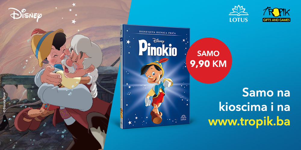 Dobro došli u svijet knjiga koje odrastanje čine ljepšim. Za vas smo odabrali 30 najvećih klasika koje je ugledna književnica Sanja Polak obogatila svojim jedinstvenim uredničkim dodirom. Pinokio je druga slikovnica iz nove kolekcije Disneyjeva riznica priča koja će vas i vaše najmlađe povesti na putovanje ispunjeno ljubavlju i mudrošću. Vjerovatno nema djeteta koje ne zna ko je Pinokio i što se dešava s njegovim nosićem kad laže. Već više od sto godina uči djecu širom svijeta o vrijednostima istine i nesebičnosti. Drugu knjigu pronađite na kioscima širom FBiH!