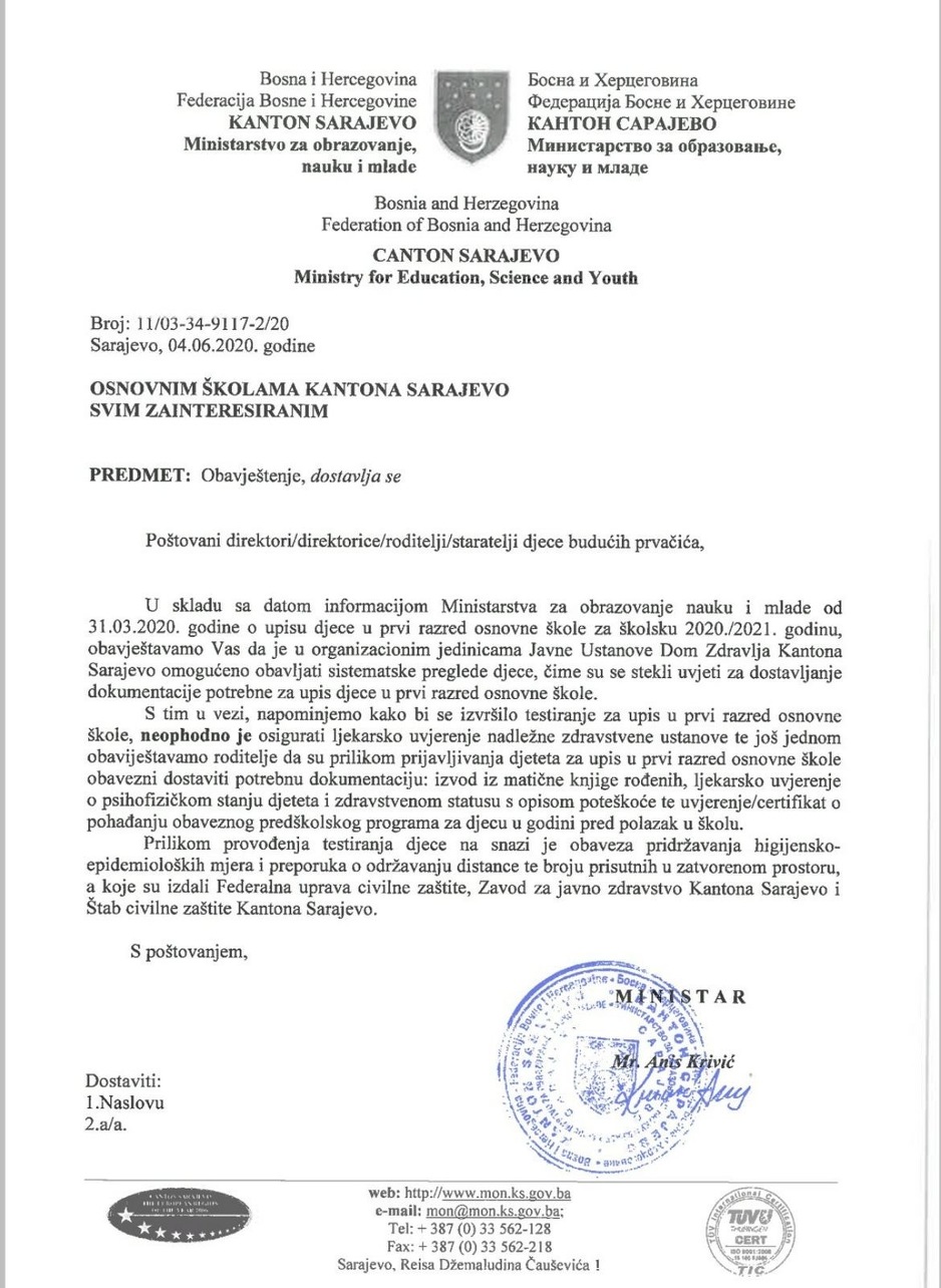 “Zakon o osnovnom odgoju i obrazovanju predviđa da bi došlo do upisa prvačića, oni moraju donijeti ljekarsko uvjerenje o psiho-fizičkoj sposobnosti djeteta za nastavu. Međutim, s obzirom na to da nam je pandemija promijenila sve i da domovi zdravlja tek sada lagano počinju raditi, imamo problem jer su se zbog ljekarskih uvjerenja koja se izdaju prvačićima, a koja roditelji nabavljaju u nadležnim domovima zdravlja, stvorile velike gužve”, pojašnjava Hasičić.